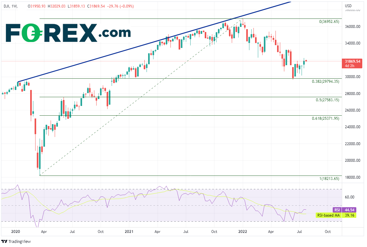 从周图看,道指在2020年月疫情期间于18214附近形成低点,此后和很多其它股指一样起飞。全球爆发新冠疫情,美联储明显将在未来数月里实行极其宽松的货币政策。在2022年第一周,道指于36952.65创下历史高点,相比前述低点上涨1倍。股指随后回撤,在6月13日当周跌至疫情低点到1月高点行情的38.2%回档位,即29653附近。价格之后小幅回升,等待新的刺激力量。
