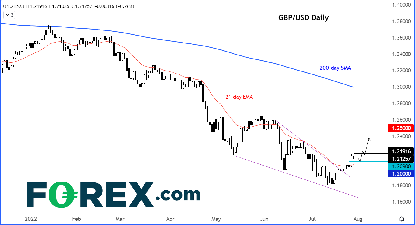 如果英国央行届时扩大加息幅度,或促使英镑/美元上探1.20一线中轨,可能在周五终了前到达1.2500。如果伴随着更多糟糕的美国宏观经济数据,该货币对可能如虎添翼。