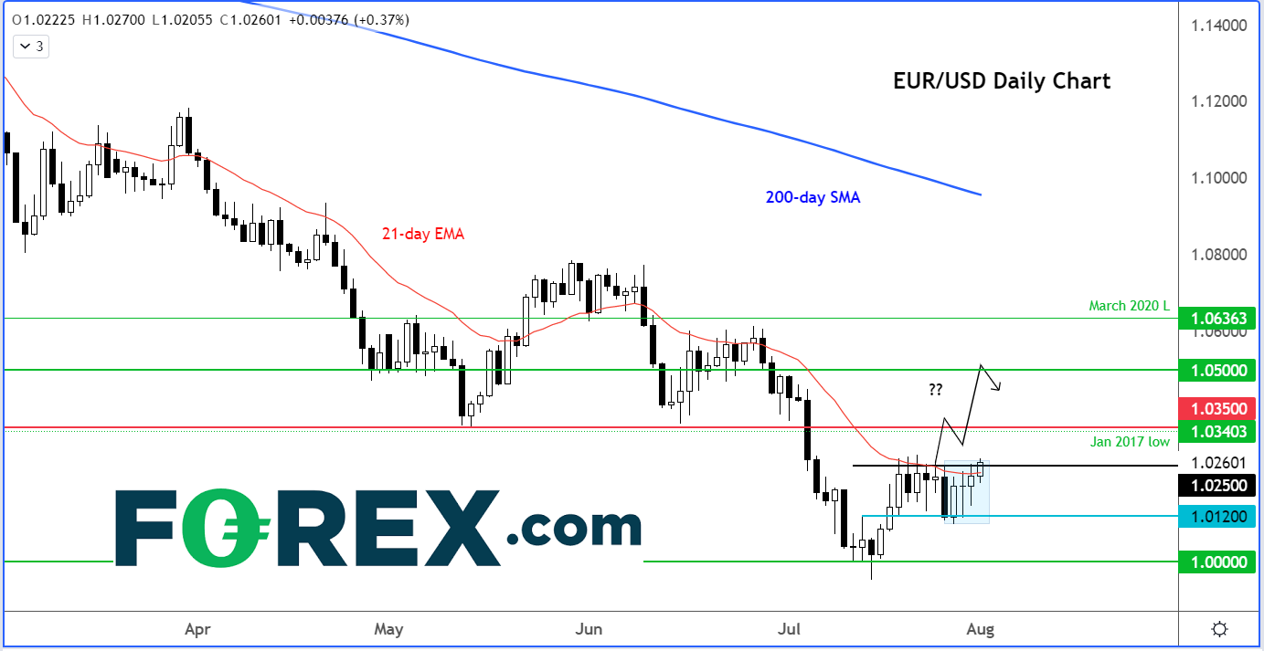 欧元/美元有望在上述数据的作用下明确上破1.0250阻力区域,上攻1.0350潜在阻力位: