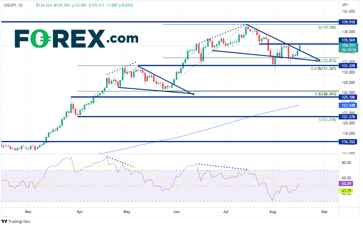 美元/日元持续上涨,在零售销售数据发布后保持涨势。该货币对日图继站上116.35的水平阻力位后在3月11日开始大举冲高,于5月9日摸至131.33,之后因为RSI超买而回撤,形成下降楔形,至3月31日低点到5月9日高点行情的50%回档位,即126.36附近。几天后,价格站上楔形的上轨下降趋势线,并再度起飞,于7月14日到达1998年以来最高点139.91。之后又一次因为RSI超买而回撤,并形成下降楔形,这次回到了61.8%回档位,回撤幅度大于第一次的50%。价格当时假性下破楔形的下轨趋势线,今天则向上突破上轨下降趋势线。该货币对这次有可能再度起飞吗?