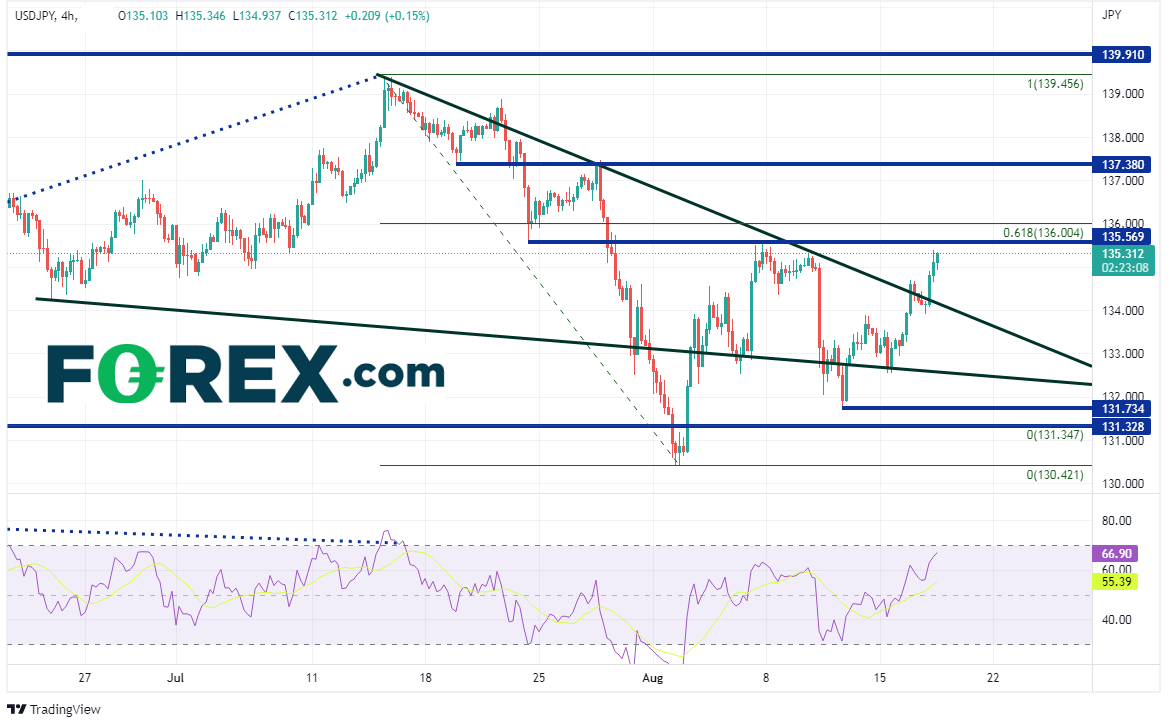 美元/日元4小时图要想继续上涨,第一步必须攻克135.57阻力位,然后是7月14日高点到8月2日低点行情的61.8%回档位,即136.00附近,接着有望上看7月14日高点下方的水平阻力位137.38。如果受制于短线阻力,可能下看楔形的上轨下降趋势线与今天低点133.90,然后是楔形的下轨趋势线132.56附近,接着是8月11日低点132.71。