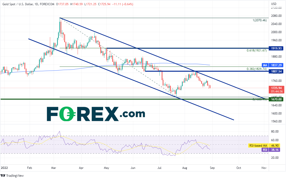 受到加息可能性的打击,现货黄金/美元不断走低。在鲍威尔上周五讲话发布之后,金价自1802.52高位下跌至目前的1720.38附近,后市会继续下跌吗?从日图看,1670一直是重要的支撑位,2020年4月以来大约6次帮助价格反弹。金价守于其上时,两次最高摸至2075附近,有可能形成了双顶形态,其颈线在1670附近,那也是2019年4月低点到2020年8月3日高点行情的50%回档位。如果最终下破该大关,价格可能完成双顶形态,剑指1285,即2019年4月低点附近。