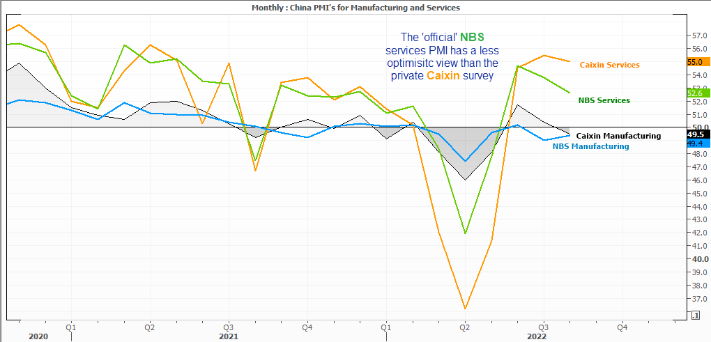 值得注意的是,国家统计局的官方服务业PMI报在52.6,与财新的55读数之间有轻微的差异,而统计局的PMI调查报告传统上一直是两者中较乐观者。虽然有这样的差异,两者都认为制造业正在萎缩。多家大银行在过去一周纷纷下调中国2022年的成长目标,其中一些较低的估计值只有3%左右。