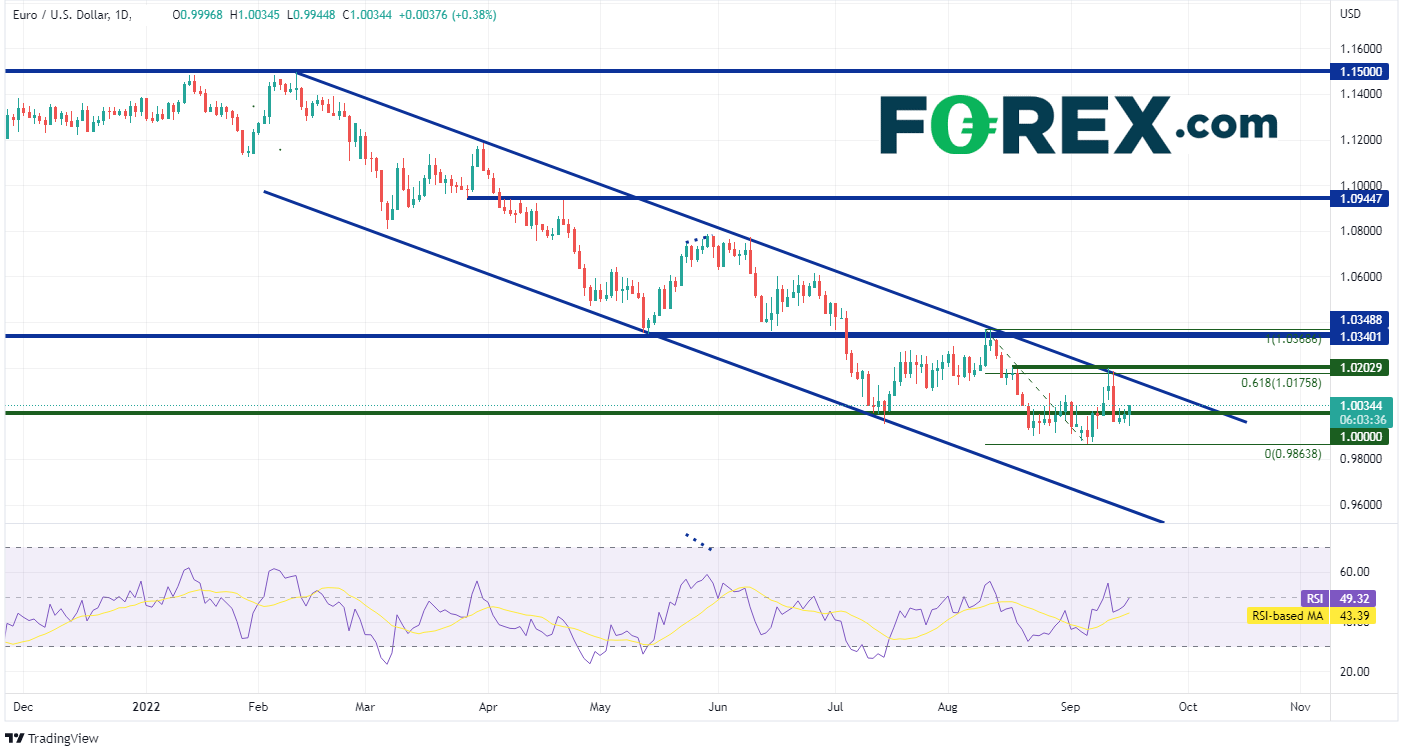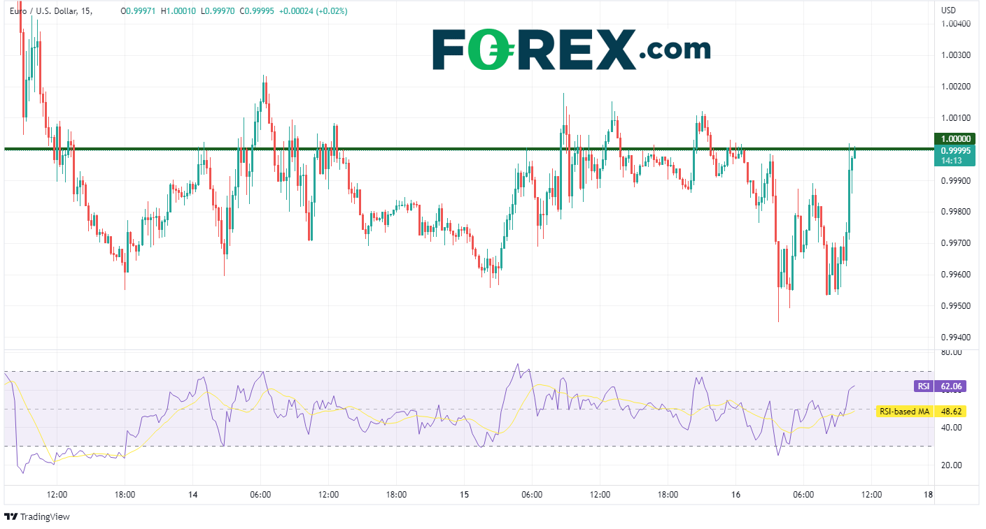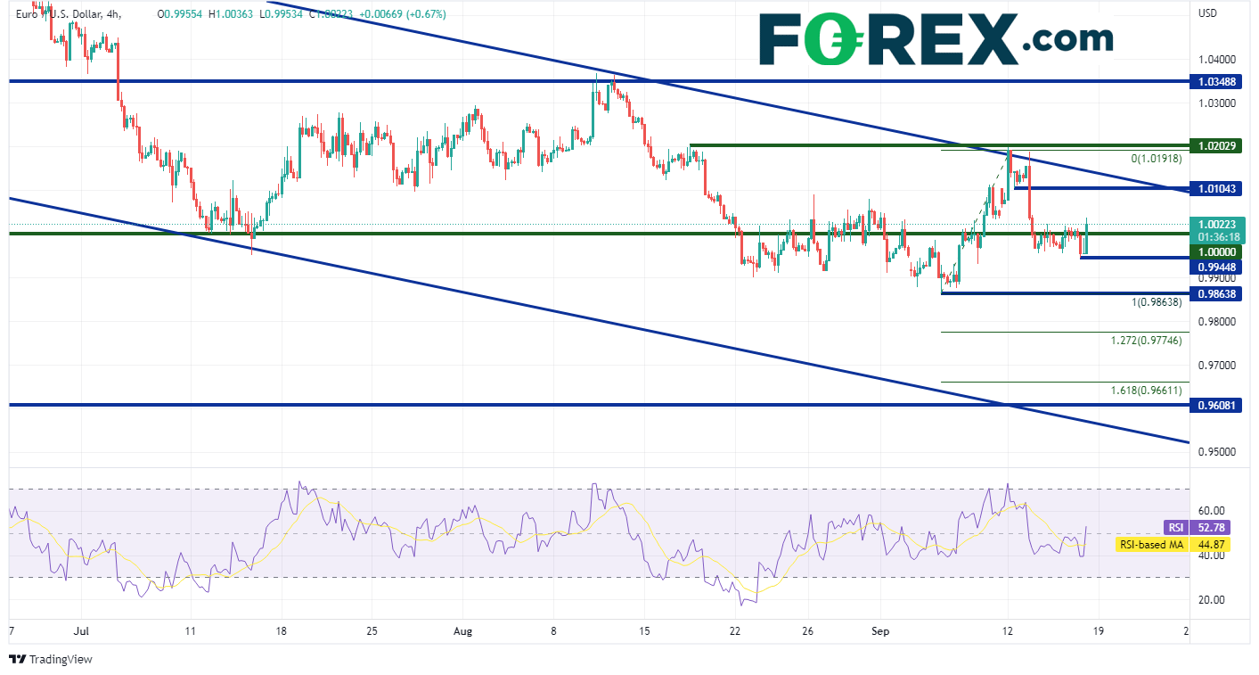 数据甫一发布,欧元/美元旋即上涨。加息100个基点的担心降温,推动货币对上攻平价。