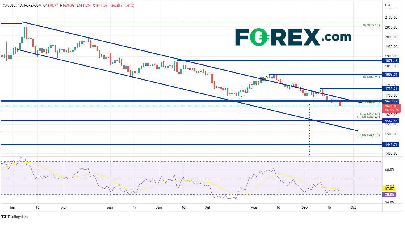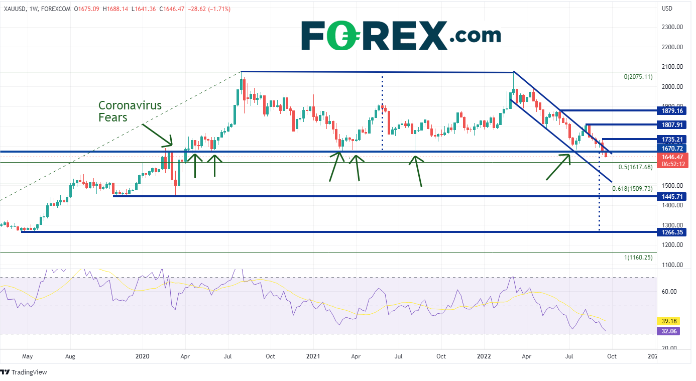 继3月7日当周在2075.11附近形成双顶以来,现货黄金/美元不断走弱,并形成下降通道。金价上周下破曾6次发挥支撑作用的1670/1680重要区域,也突破了双顶形态的颈线。该形态突破后的目标在颈线突破位加上双顶到颈线的高度,本例中在2019年5月低点1266.35附近。