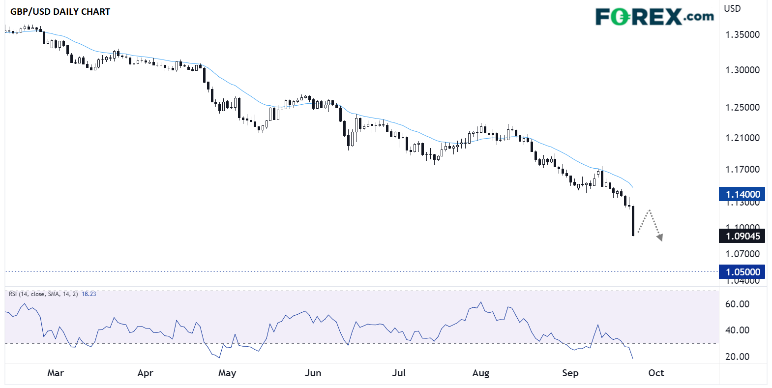 交易员关心短线止跌位。英镑/美元下破了疫情以来低点,可能适时地探至1985年低点,即1.0500区域。但鉴于14天RSI严重超卖,价格或先在空头回补带动下回升,前提是未来一周左右里金融市场保持相对稳定。也存在英国决策层今后几天干预市场,阻止英镑暴跌势头的较小可能性。