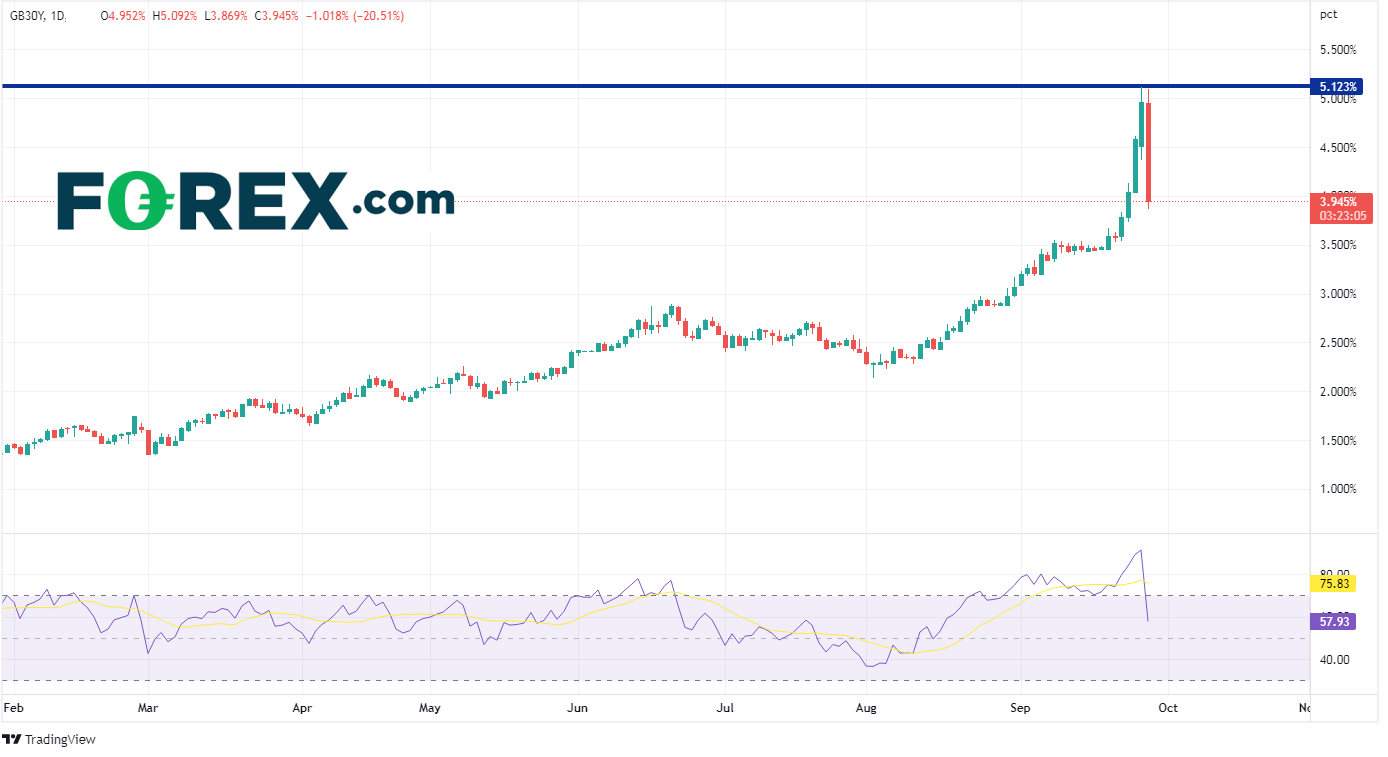 英国央行周三干预债券市场。据媒体消息,此次干预的原因是负债驱动型投资的养老金基金面临追加保证金的威胁。央行表示,将从今天开始直到10月14日,购买到期期限在20年以上的金边债券。30年期金边债券收益率因此从当天高点5.092%,下跌至3.869%低点。还记得央行上周四刚刚宣布加息50个基点,将基准利率上调至2.25%,并且声称开始抛出所持金边债券,每年减持800亿英镑。今年的抛售时间点已延后,至10月31日。30年期金边债券收益率上周四开盘价为3.535%,自那以后剧烈震荡。但请注意,震荡背后更多地是因为对首相特拉斯新推出的财政政策的担心,而不是对英国央行货币政策的关切。自上周五开盘以来,30年期金边债券收益率上涨134个基点,而今天几乎将其回吐殆尽。