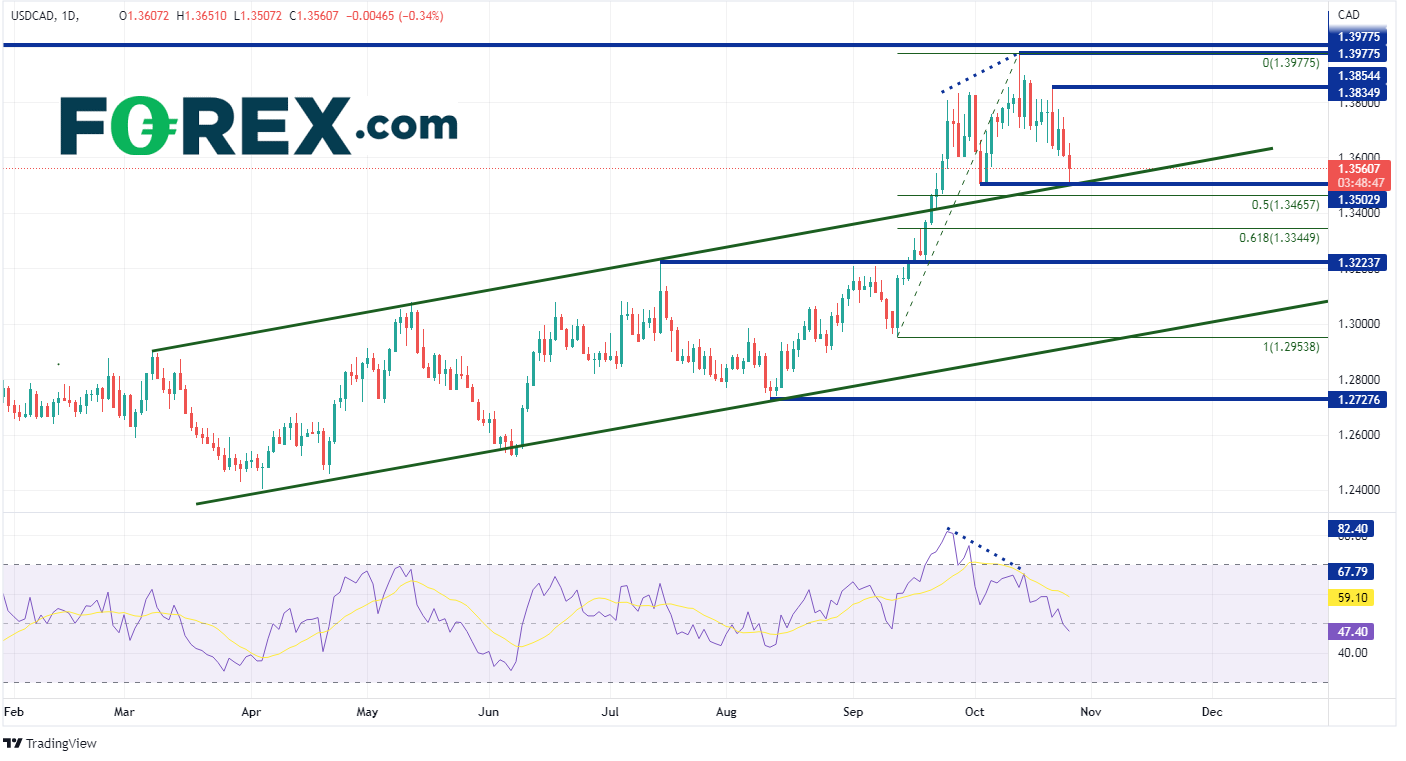 在日线图上,美元/加元已跌至关键支撑位,即10月4日低点和之前上行通道的顶部交汇处1.3502附近。从9月13日低点到10月13日高点区间的50%回撤位略低于1.3466,然后是同一区间的61.8%斐波纳契回撤位1.3345。但如果交易者将此视为在下周FOMC会议前买入美元的机会,则第一个阻力位在10月21日的高点1.3854,然后是10月13日的高点1.3978。如果价格继续走高,下一个阻力位在1.4007,即2020年5月25日那一周的高点。