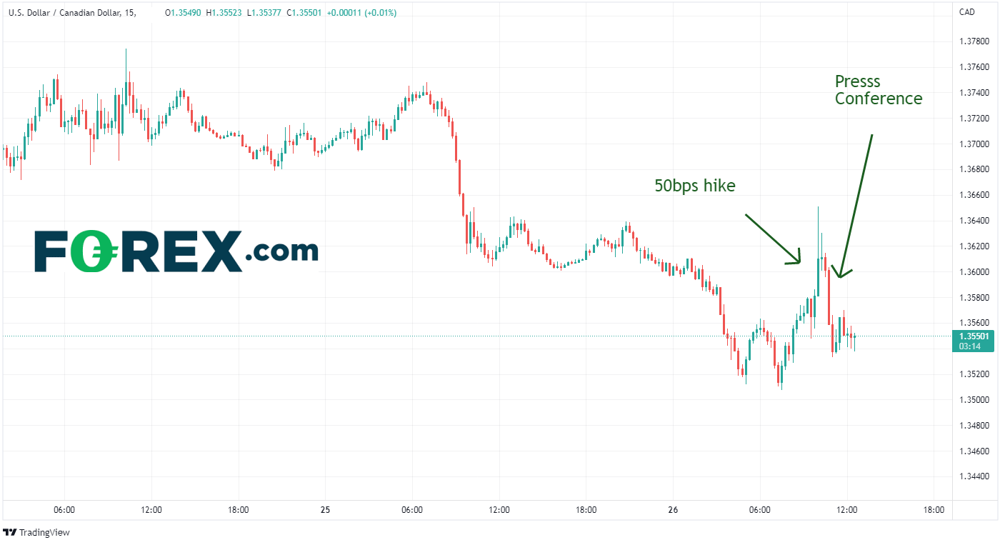 从15分钟图上可以看出,美元/加元最初在加拿大央行宣布加息50个基点后,涨至日线高点1.3651。这是交易者可预见的低于预期的加息会引起的价格走势。然而,在新闻发布会开始后,该货币对跌至1.353,比利率决议公布前还低。因为根据麦克勒姆的发言,交易者判断12月7日可能会加息75个基点。