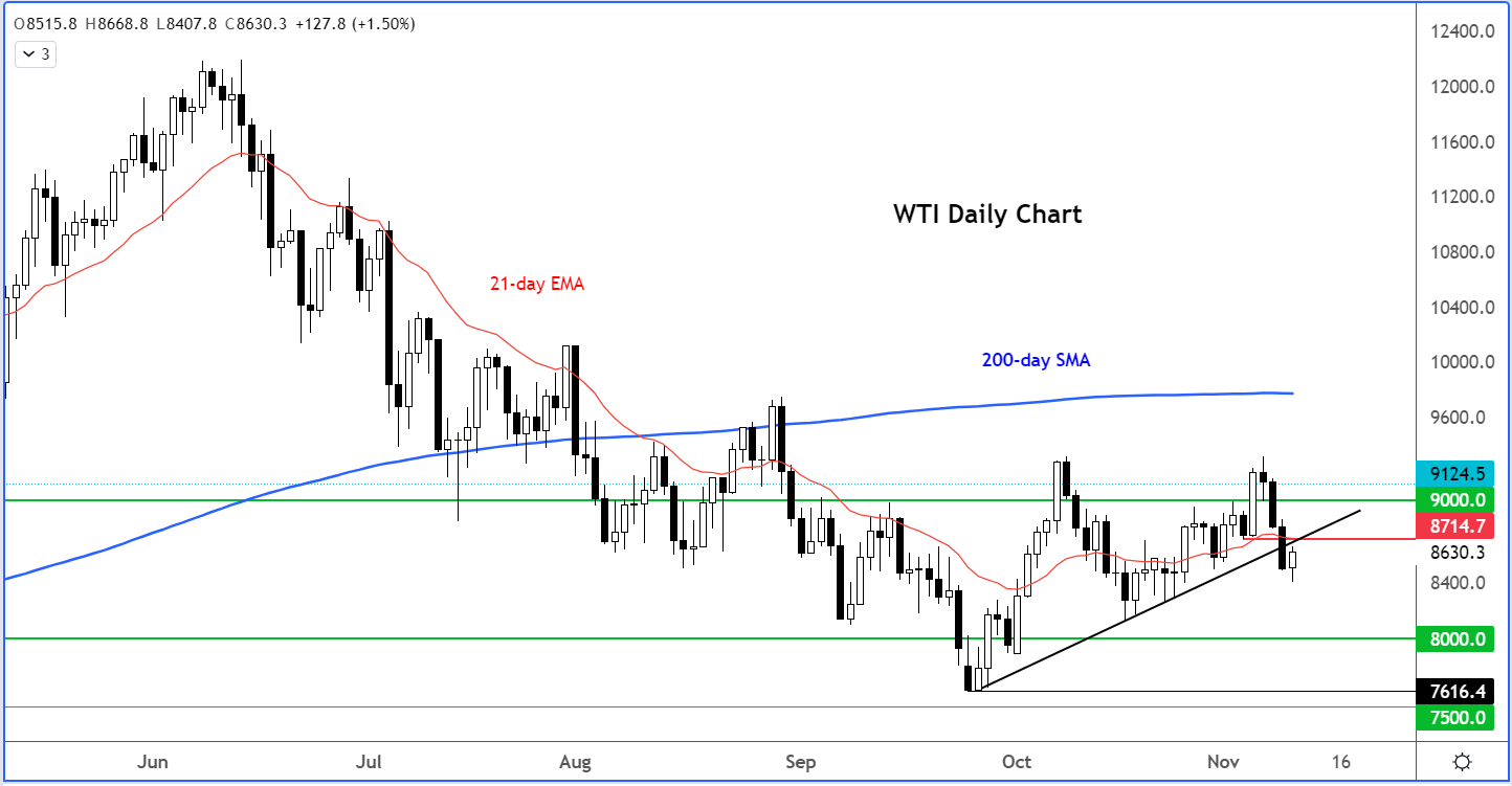 11 Nov 2022 今天的美国通胀报告令市场普遍大涨,因为美联储在12月进一步加息75个基点的风险已被排除,并且降低了对最终利率的预期。7.7%的年化CPI远低于预期,较上月的8.2%大幅下降。对于密切关注通胀的投资者来说,这是个好消息。另一个好消息是最近一些能源价格下跌。原油突破这一趋势线可能会导致油价进一步下跌,从而推动通胀更大幅度地下降。