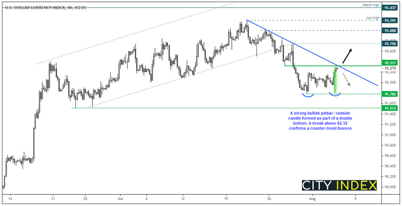 美元指数形成看涨外包K线,在50和200天指数移动均线上方加速上冲。4小时图在双底(91.78)形态内呈现强劲的看涨pinbar/外包K线,当天收于趋势线阻力位和92.31低点下方。这最终是一个中枢区域,但我们倾向于美元指数站上92.32,逆势反击92.75-93.00。