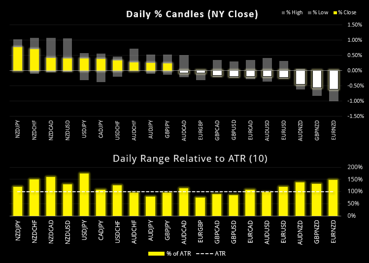 在昨天整个欧洲和美国时段,纽元都守住领先优势,在强劲就业报告提振加息预期的帮助下成为最强货币。纽元/日元和纽元/瑞郎为最强交叉盘,但原因并非经典的“冒险”套利交易,而是疲弱的美国就业数据使得交易者买入美元避险,令美元战胜日元成为次强主要货币。纽元/美元止步于0.7100目标下方不远处,日图收出看跌锤子形态,暂时横盘。日元和瑞郎为最弱主要货币,除纽元外,其它货币兑美元都下跌。