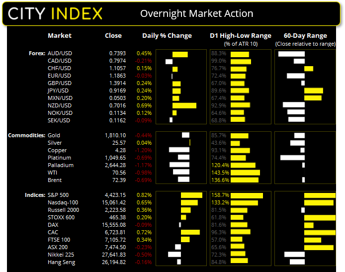 标普500指数在20天指数移动均线企稳后反弹,收盘创下历史高点并形成看涨外包K线(虽然收盘价低于盘中高点4429.97)。如果站于其上,可以假设涨势延续。部分欧洲股指同样强劲收高,其中STOXX 600 和 CAC延续创记录收盘行情。期货市场目前指向亚洲市场高开,即使中国股市目前继续承压,近期表现明显落后。