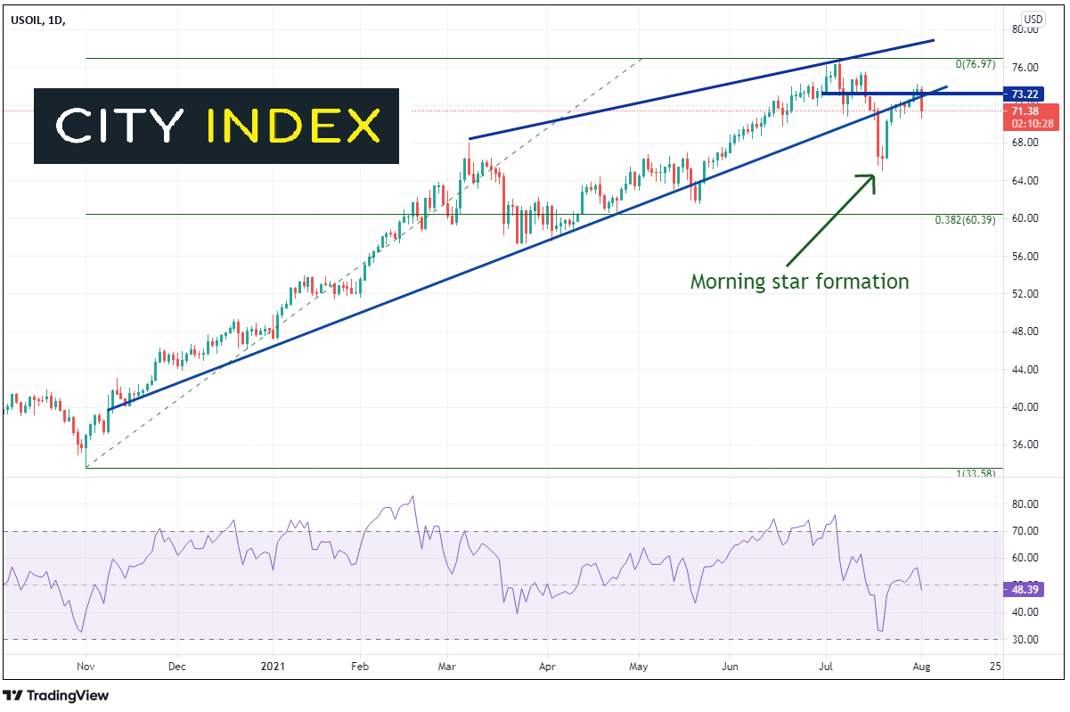 随着全球两大经济体制造业活动放缓,原油受创。在制造业蹒跚和德尔塔变异毒株蔓延或导致需求下降的担忧中,美油价格今天下跌超过3.3%。从日线图来看,美油自2020年11月2日33.67附近低点以来一直在推高。3月8日,上升趋势开始构筑上升楔形并于7月6日达成76.95高点。7月19日,油价大幅下破楔形,然后在2天后就反转跌势。该三K反转形态被称为晨星形态。价格上周五重回楔形内部收盘,但今天再度下破。上方强劲阻力落在通道底部趋势线以及水平阻力73.22附近。若升穿,或测试近期高点76.95,然后是楔形上方趋势线79.00附近。今天未能守住阻力或带动油价探入7月20日低点65.11,然后是2020年11月2日低点至7月6日高点上行之38.2%回档位60.39附近。
