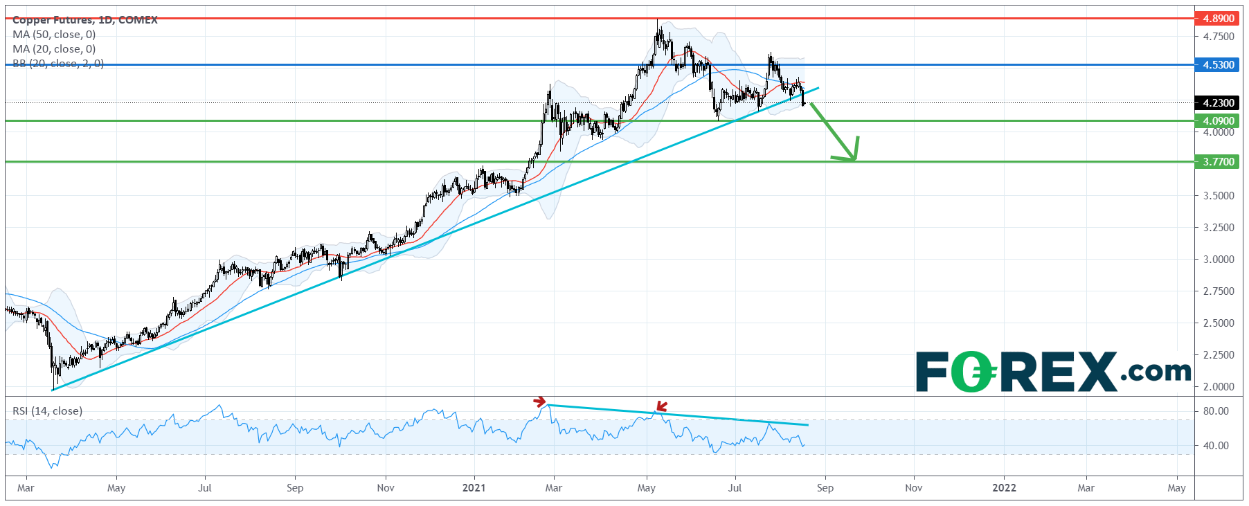 从技术角度看,如日线图所示,芝商所铜期货价格呈现反转向下的初步信号。它跌破了去年3月以来的上升趋势线,相对强弱指标亦出现看跌背离。