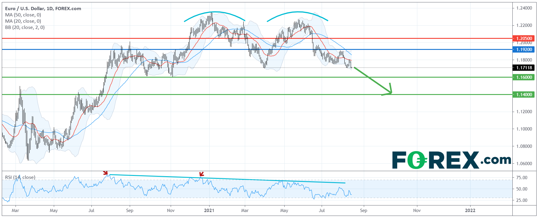 从技术角度看,如日线图所示,欧元/美元的下行压力增强。此前,它形成了一个双顶形态,目前正在威胁颈线水平。