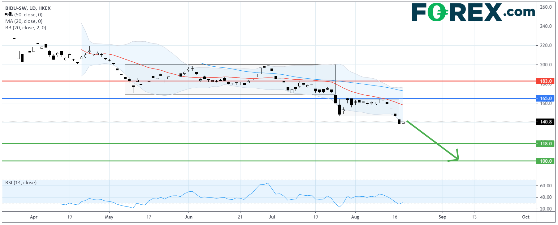 在日线图上,百度的技术走势仍然严峻。目前,股价跌破了过去数周的盘整区,进一步远离20日及50日移动均线。