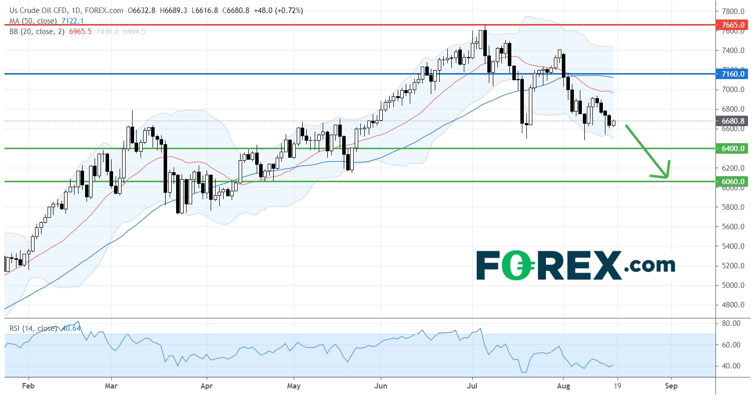 美国原油CFD仍然受压,若跌至支持位6,400点,将进一步下滑至6,060点。看跌的主要阻力 (止损) 位在7,160点。