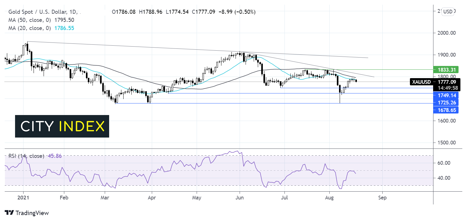 金价交投于50和100均线之下,并低于看涨趋势中自6月初以来下行趋势线。