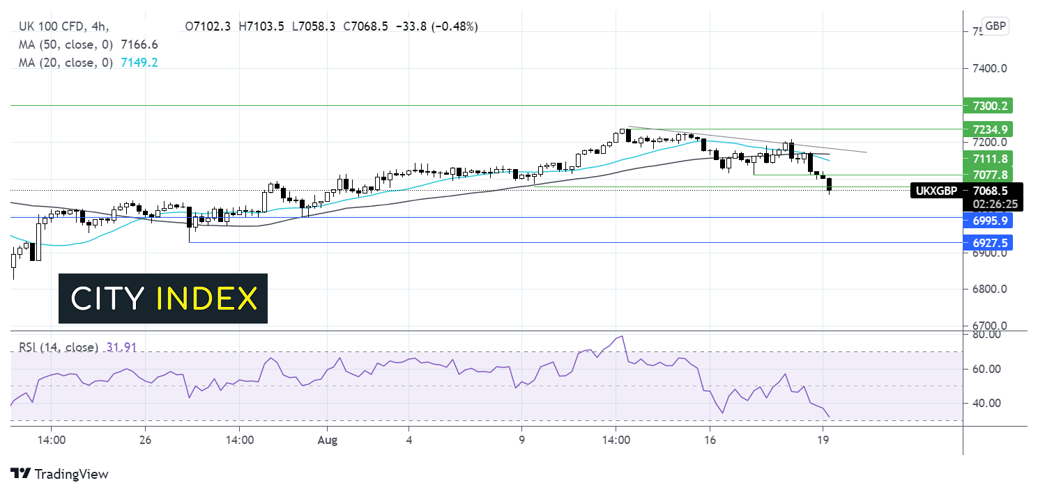 价格已跌穿水平支撑位7090(8月9日低点),正探向心理关口7000、7月30日波段低点6995以及7月27日低点6930。