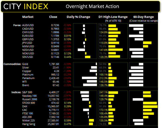 所有美国基准股指都下跌1%左右并且收在各自的20天指数移动均线下方。标普500指数有10个板块下跌,领跌的是能源和科技股。纳斯达克生物科技板块下跌1.3%,标普500指数和Russell 2000指数的价值股同样承压。