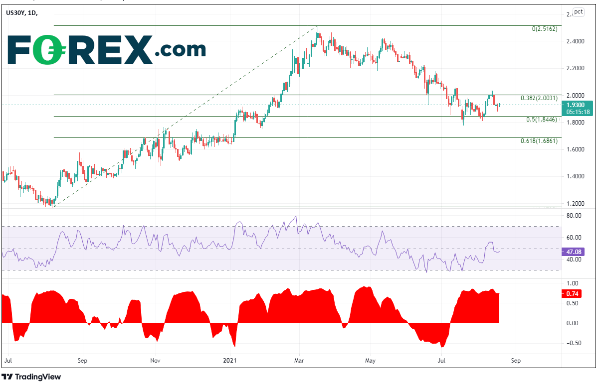 30年期债券收益率已自3月18日高点2.2156回落至7月20日的低点1.7800,但长期债券收益率设法守住了2020年8月7日低点到3021年3月18日高点行情的50%回档位构成的支撑,即1.8446附近。自从在7月20日最低到达1.7800以来,30年期债券收益率一直围绕着1.8110-1.9720区间起伏,等待美联储给出新的信号。请注意日图上30年期债券收益率和美元/日元之间的关联系数:目前报在+0.74。该数字6月初从负值回升,随后持续走高,最高到达+0.85,到了7月底趋于平缓。正如我们在以前文章所讨论的,债券收益率近期的走势可以帮助美元/日元交易者判断方向。收益率上涨,美元/日元随之走高,反之亦然。