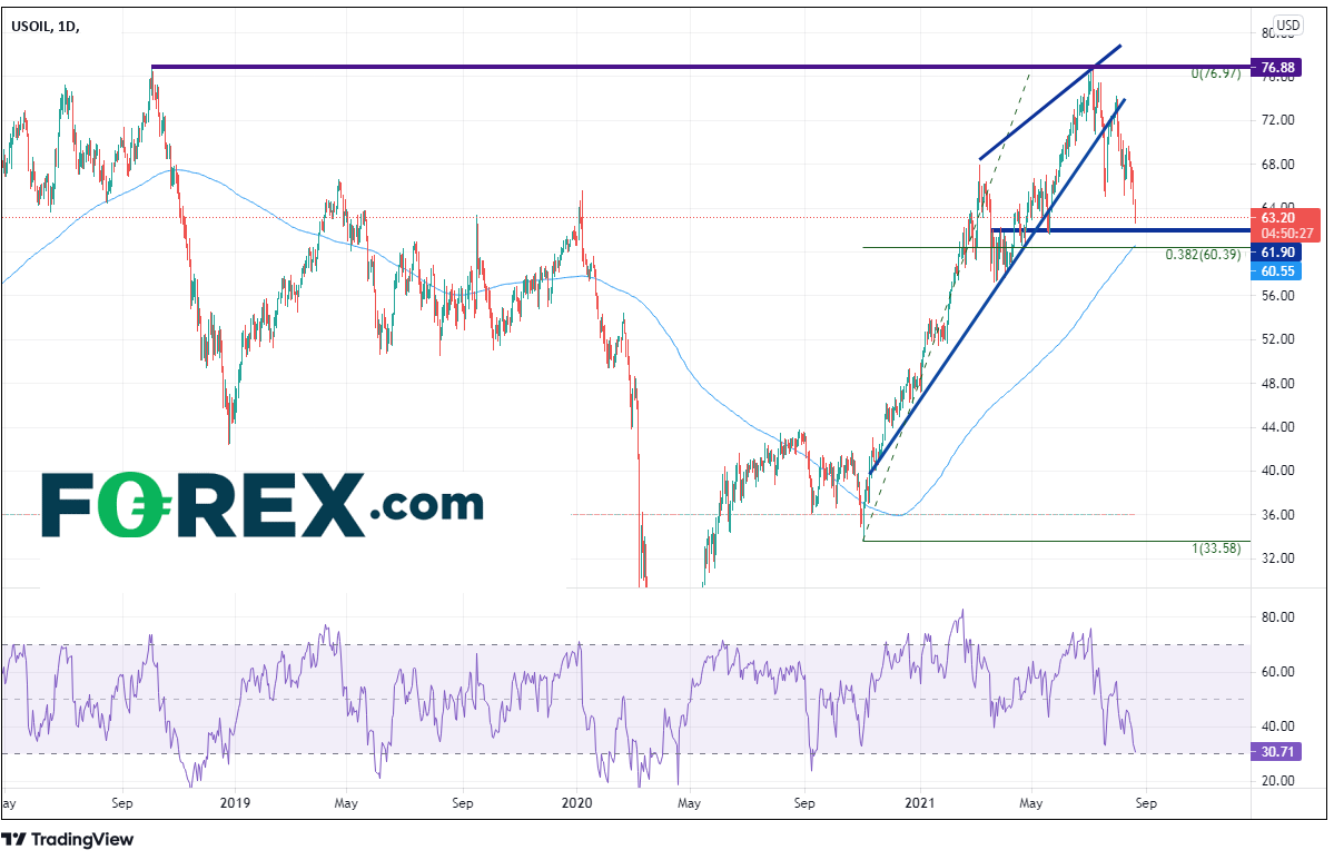 美国原油合约已在较长期的日图上从2020年4月20日的0.00上涨至2021年7月6日的近期高点76.97,上涨途中形成上升楔形且测试了2018年10月以来高点。该合约价格最终于7月19日下破上升楔形且在回踩下轨趋势线时未能守住该趋势线。8月2日以来价格下跌15%左右,但下方不远处就是由多个价位构成的支撑区域,包括200天均线60.56、2020年11月4日低点到7月6日高点行情的38.2%回档位60.39附近、水平支撑位61.90。