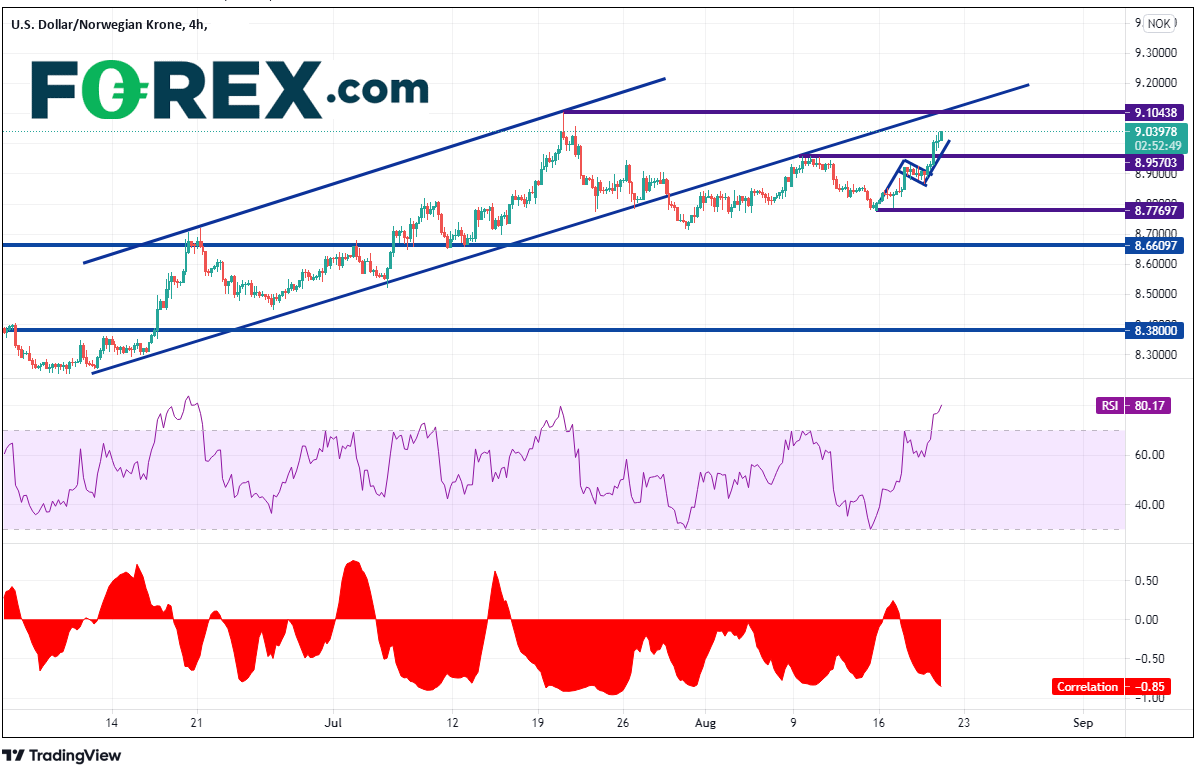 美元/挪威克朗的4小时图走势和美元/加元相似,其与美国原油合约之间的关联系数为-0.85,也是高度负相关。RSI报在80.17,和美元/加元一样,美元/挪威克朗眼下超买,可能准备回撤。如果油价反弹,美元/挪威克朗可能下探水平支撑位8.8624附近,接着是8月16日低点8.7770。如果下破后者,价格可能回落至旗杆底部8.6610附近。如果油价继续走弱,美元/挪威克朗可能反击7月20日高点与上升趋势线相汇而成的强阻力9.1044附近。