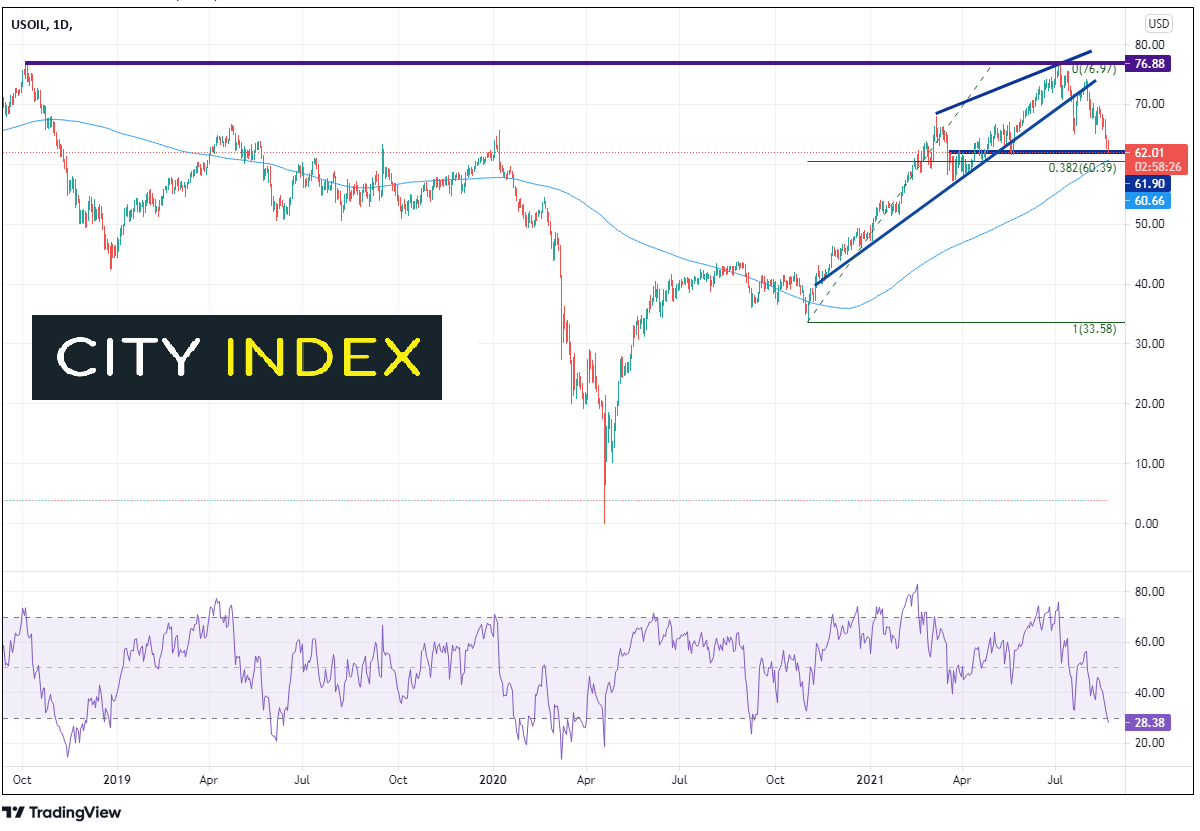 美国原油上周下跌近8.65%。我们在周初展示了该图表,阐述其与美元/加元(上周上涨2.65%)和美元/挪威克朗(上周上涨2.67%)之间的高度负相关联系。西得州原油差价合约在7月时测试了2018年10月以来的高点但以失败告终,随后下破上升楔形。价格反击楔形的下轨趋势线,又失败了。从那以后,西得州原油差价合约下跌14%。但油价跌势已止步于60.39-61.90区域构成的支撑带,那是2020年11月低点到近期7月高点60.39行情的38.2%回档位所在、200天均线 (60.66) 所在,也是水平支撑位61.90所在。在该区域内,多头可能找机会出手。另请注意,RSI近期进入超卖区域,跌至28.38(低于30被视为超卖),表明反弹几率增加。日图第一阻力位在近期下影线低点65.11附近,然后是上升楔形的下轨趋势线上的近期高点74.21附近,如果站于其上,价格可望反击前高点76.88。