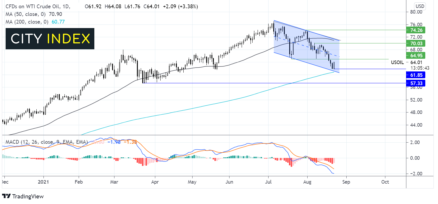 尽管今天油价上涨3%,但西德州中质原油(WTI)仍处于下行通道,200天均线于60.70提供支撑。