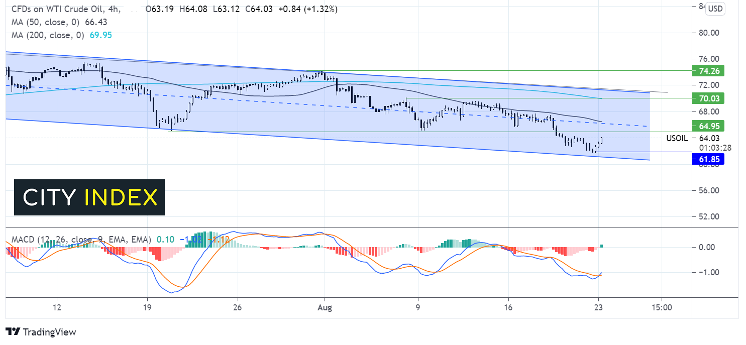 但当我们放大到4小时图,MACD看涨交叉让买盘继续保持乐观。只有收复50均线66.50,也就是下行通道中线,才有可能展开有意义的反弹行情。若拿下该价位,聚焦8月中高点和4小时图200均线70.00,此处或构筑顽固阻力。