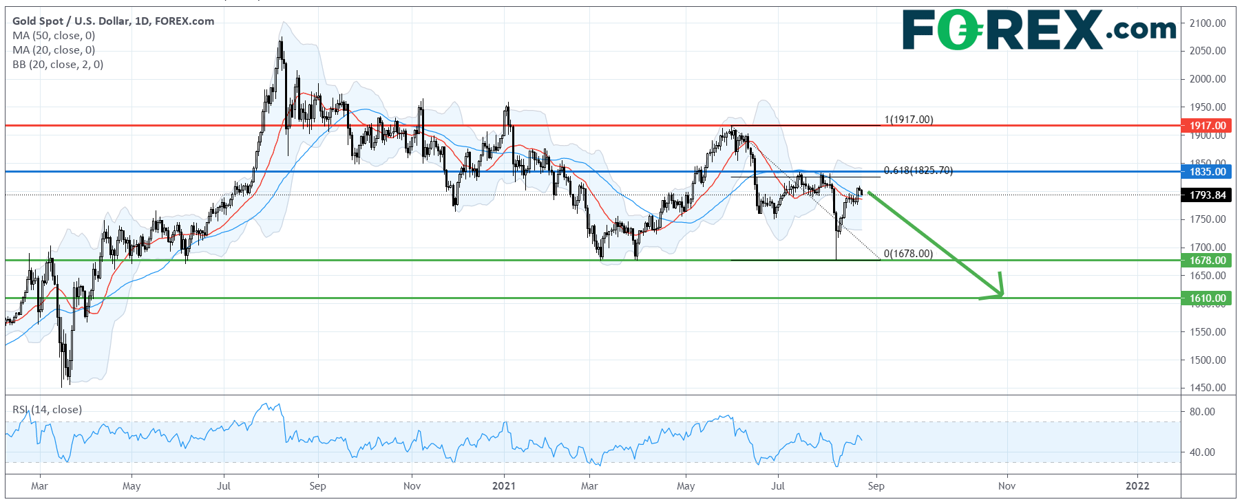 只要看跌的主要阻力 (止损) 位1,835美元不破,价格料将返回下行目标1,678美元及1,610美元。