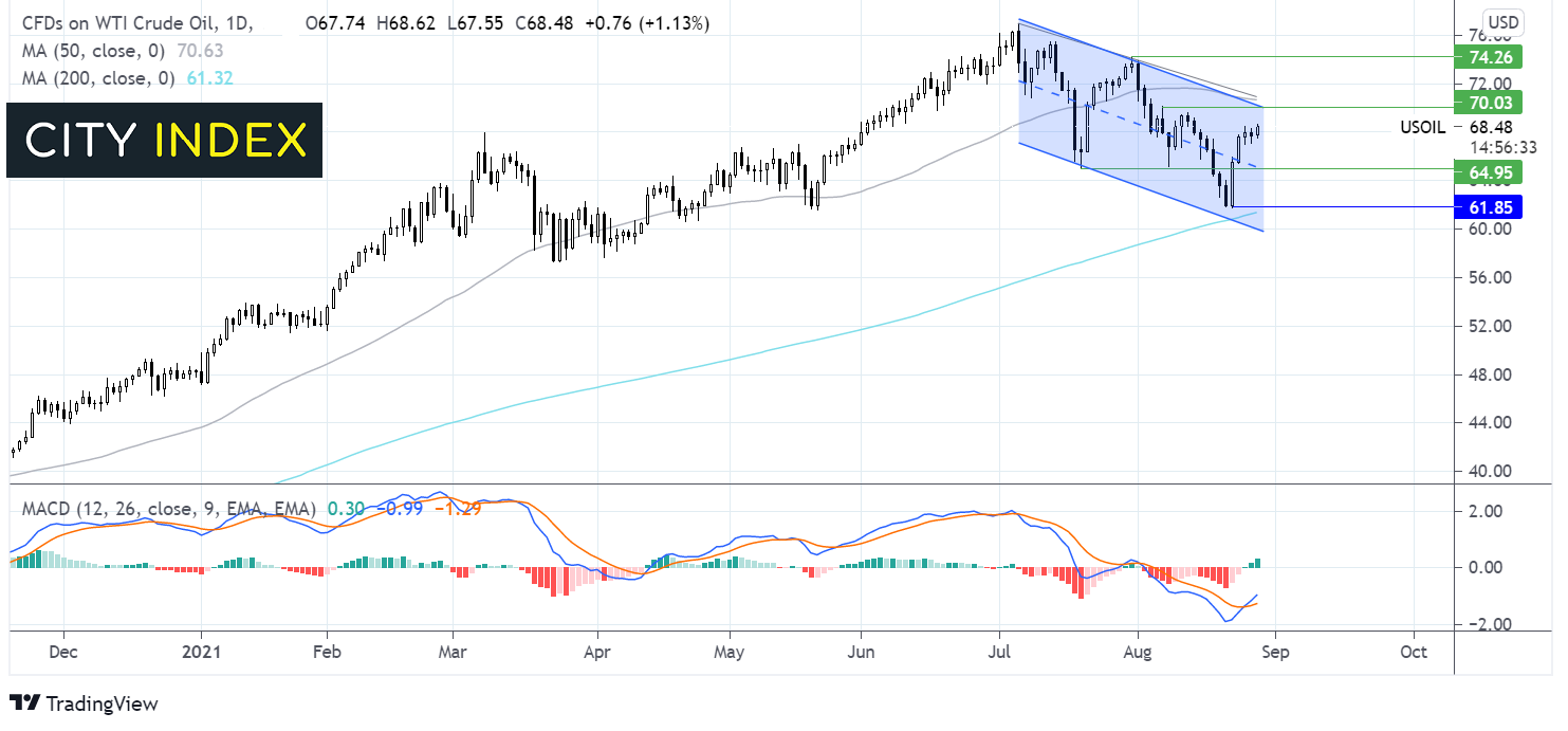 即时阻力见于70/70.50美元,此处汇聚了心理水平、下行通道上轨和50均线。该价位或很难攻克,但若拿下,后市或再度看向7月高点74.20。