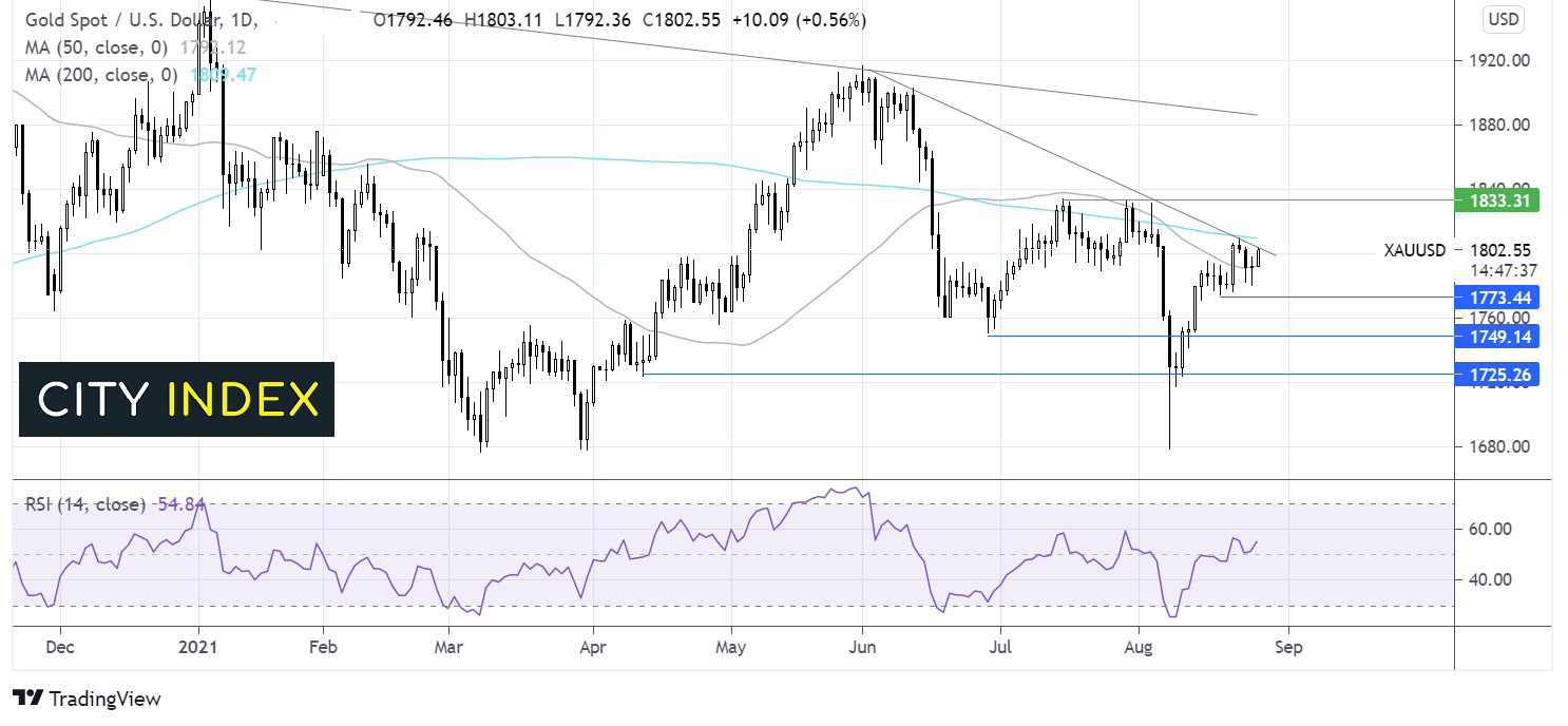 若上破下降趋势线1804未果,金价可能跌回50均线1792,然后是8月19日低点1772年和6月低点1750。