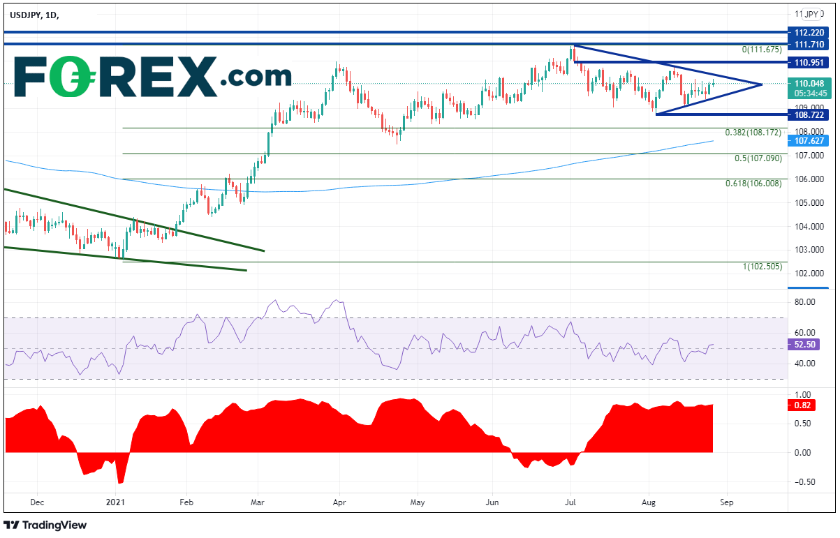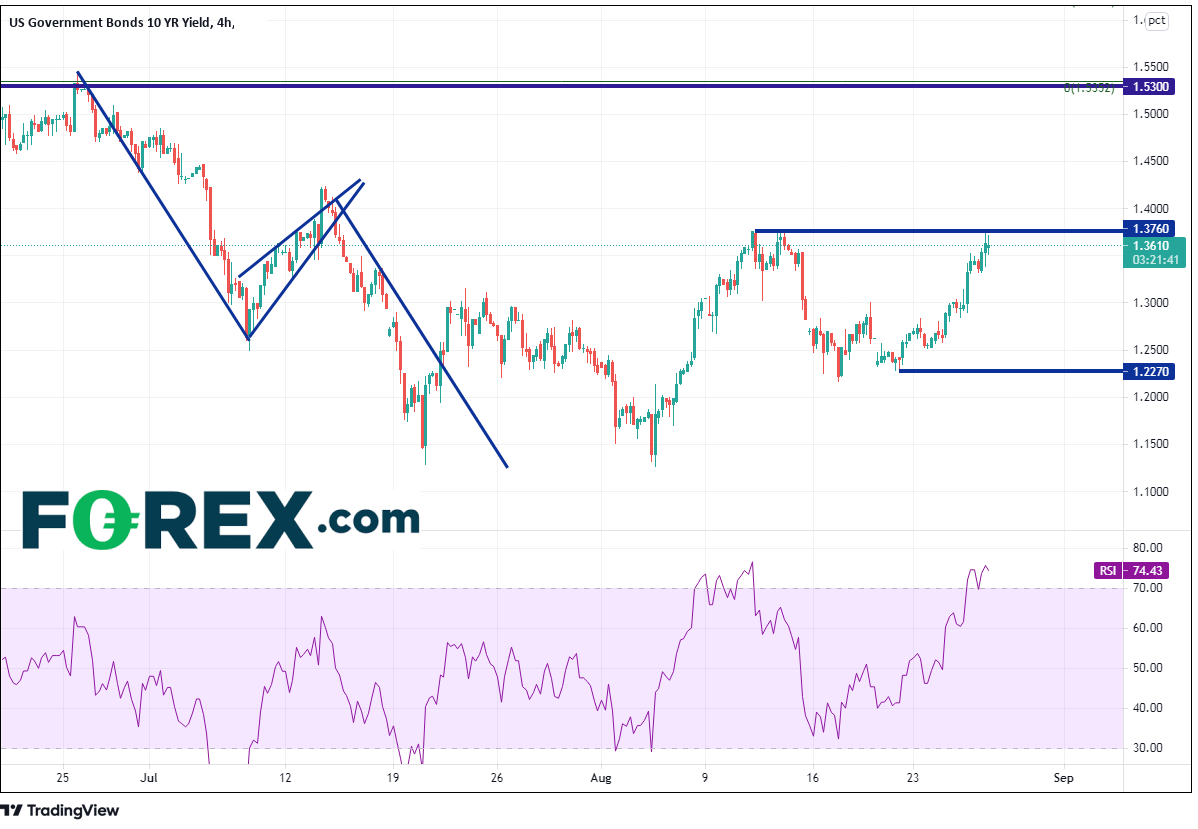 答案或许是肯定的,但债券交易员已就缩表声明做好准备。10年期美债整周都在抛售,收益率也因此持续走高。10年期美债收益率上周收于1.262,周一探入1.227,本周走势反转并大幅走高。截至撰写本文时,最高点为1.3750,较上周五收盘价上涨了10个基点,并自8月11日起一直受制于1.376水平阻力位。请注意(在收益率遇阻的同时)RSI处于超买状态,这表明债券交易员可能会在杰克逊霍尔央行年会前了结获利。