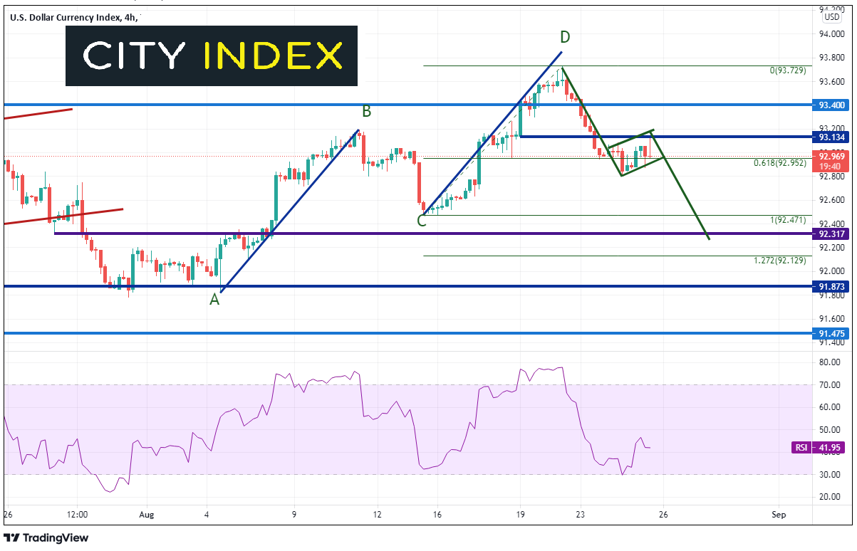 那么,美元指数会继续下跌吗?这个问题很大程度上将取决于美联储主席鲍威尔周五在杰克逊霍尔大会上的讲话。美元指数的回撤已止步于8月13日低点到8月20日高点的61.8%回档位,即92.95附近。技术面看,美元指数似乎可能下跌。如果无法站上93.14,美元指数可能形成旗形形态,目标是突破位加上旗杆长度,即92.25附近。然而,在那之前首先必须击穿旗形底部支撑位92.80和8月13日低点92.47。