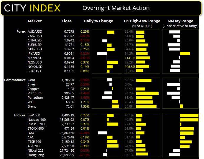在又一清淡交投的时段,美国股指隔夜再次小幅上扬。标普500指数午盘前走高,一度站上4500,随后在收盘前最后一小时回吐涨幅,当天收高0.22%。金融与能源板块表现出众,而必需消费品和不动产投资信托拖累整体股指表现。Penn National Gaming和Western Digital Corp表现优异,分别上涨8.7%和7.8%。交易者在杰克逊霍尔大会召开之前沽出债券,导致隔夜美国债券收益率上涨。