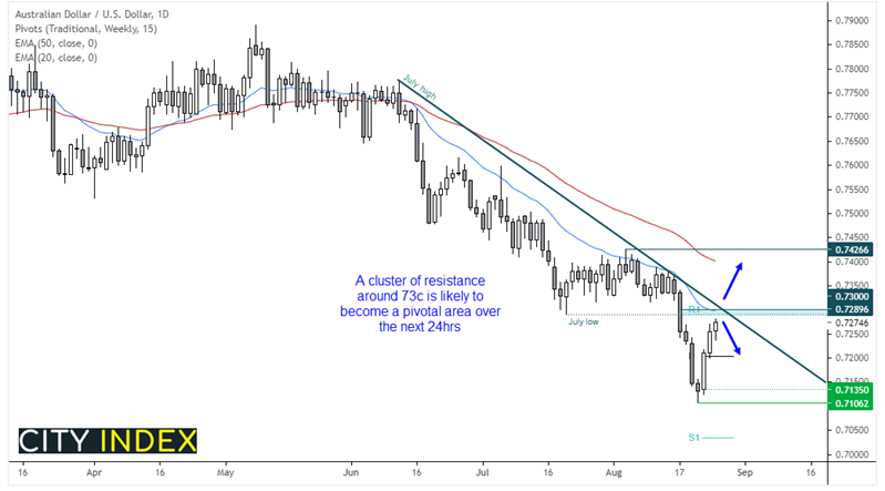 澳元/美元连续第三天反弹,是两个月中都没有过的连涨“盛况”。但该货币对即将遭遇关键阻力区域,即由7月低点、20天指数移动均线和周图第一阻力中枢构成的0.7289 – 0.7300区间,在鲍威尔杰克逊霍尔大会讲话之前可能是中枢区域。在该关键事件发布前后,7月高点以来的下降趋势线同样可能构成额外的阻力带。价格受制于该阻力密集区域,趋势继续看跌,但若攻克,后续可望斩获不错的涨幅。