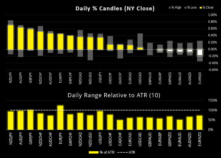 资金流出避险资产,日元与瑞郎再度成为最弱货币,流入澳元、英镑和纽元等风险货币,纽元和美元是本月迄今最强的主要货币。