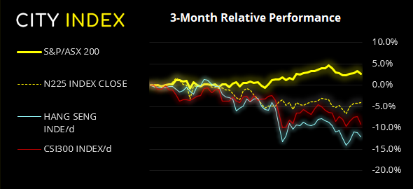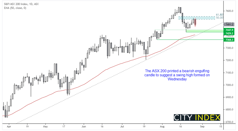 ASX 200指数打破三天逆势反弹,构筑看跌吞没K线。该K线于50%回档位附近成形,暗示修正高点周三就位,不过61.8%回档位也可为进一步波动预留空间。7430/50附近支撑区与看涨趋势线共同构筑可行的中期看跌目标。若达成,我们将重新评估股指回归长线看涨趋势的可能性。