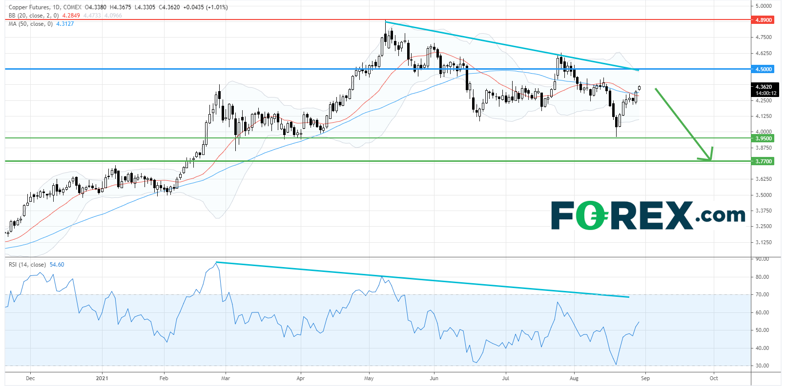 只要主要阻力 (止损) 位4.50美元不破,铜价维持整固的看法并可能回落至前低位3.95美元。下破3.95美元则可能引发下跌至3.77美元。