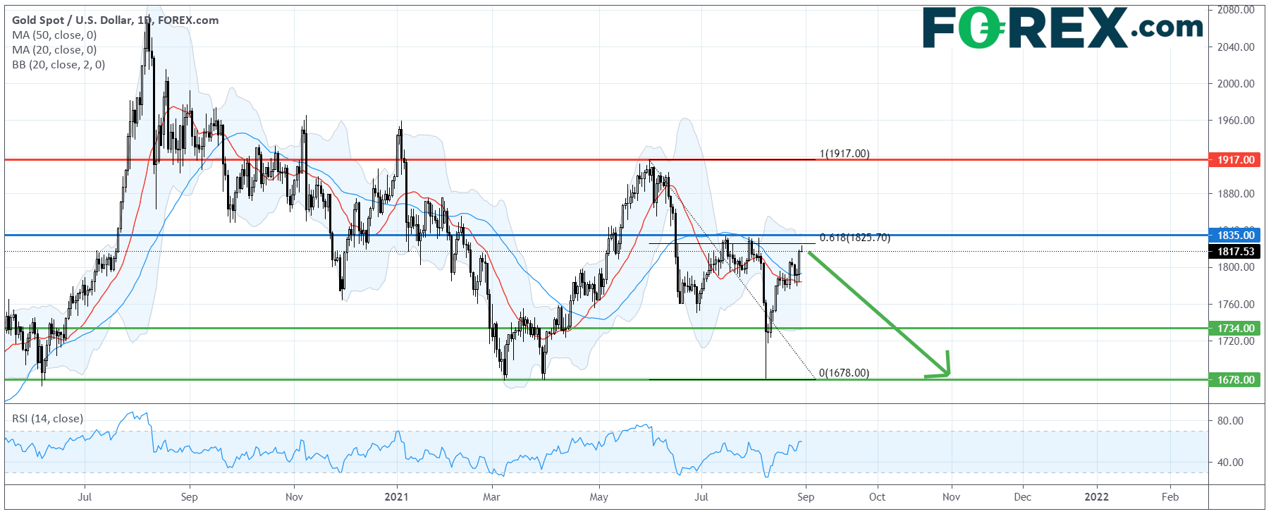 只要主要阻力 (止损) 位1,835美元不破,价格料将回到下行目标1,734美元及1,678美元。