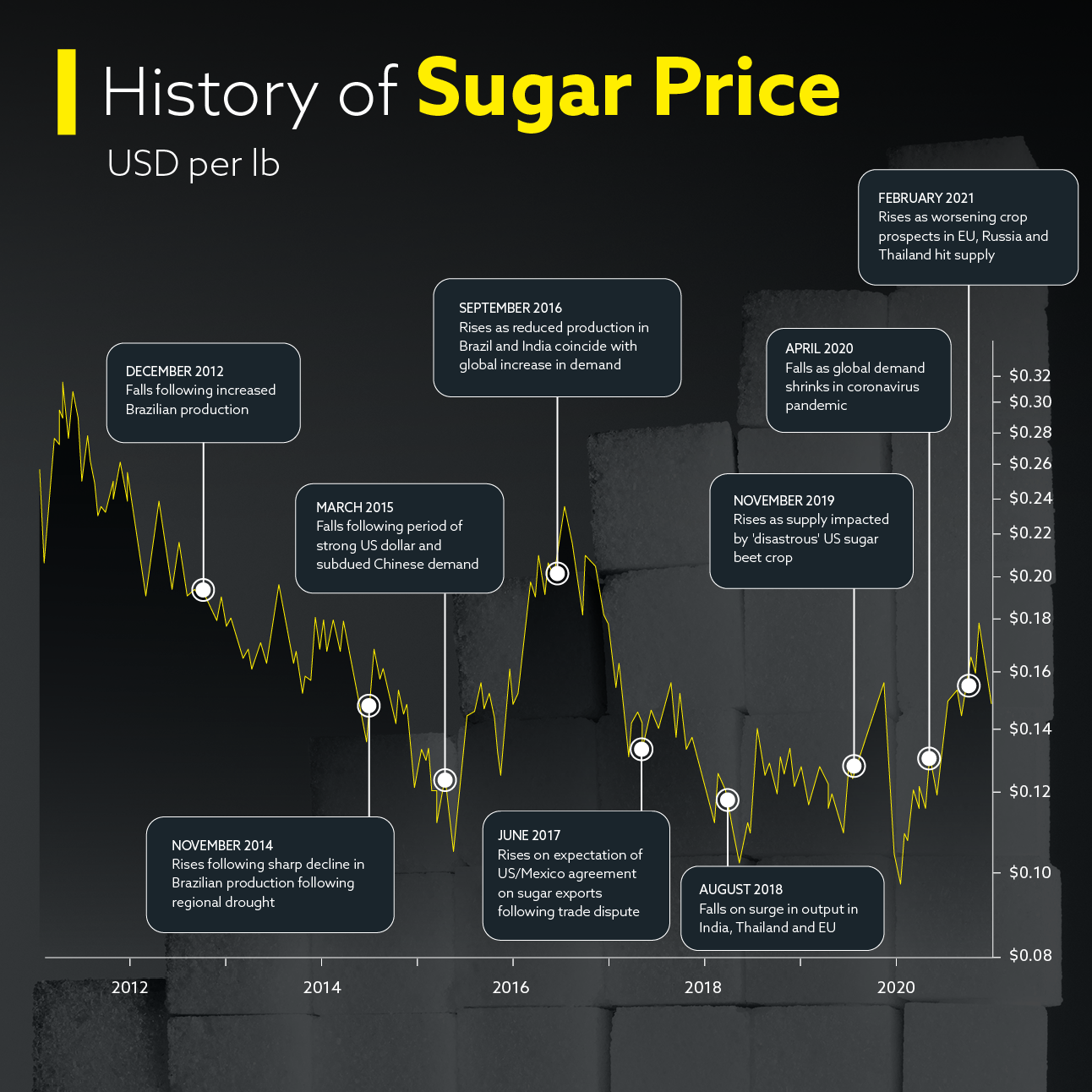 请看下图美国11号糖价格过去10年的历史,从中了解驱动此大宗商品的关键基本面因素。