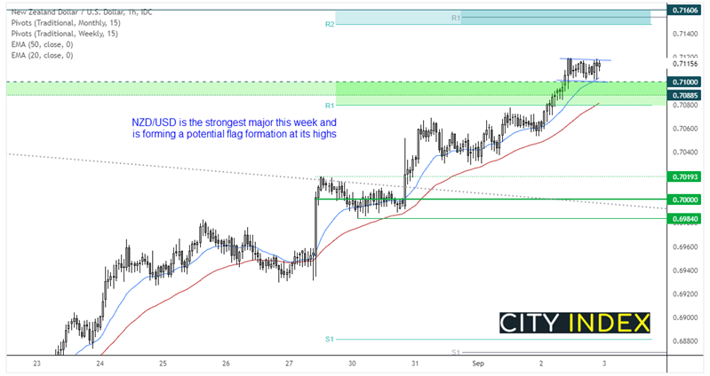 作为潜在旗形的一部分,澳元/美元和纽元/美元交投于紧密区间内部。两者之中,纽元似乎更具吸引力,因为纽元/美元已于0.7100获撑,具更大上行空间。当然,前提是美元下挫。但鉴于纽元为本周最强货币,若美元上行,考虑到纽元/美元小时图结构看涨,我们倾向对其场边观望。