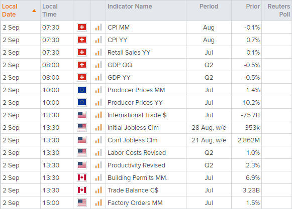 交易员们正准备迎接未来两天两份关键美国就业报告发布,亚洲股市隔夜表现涨跌互见。日经225指数升至六周高点,并于月图第一阻力枢纽和 (3月高点以来) 趋势阻力遇阻。十字线的成形暗示了趋势暂停或回调,但我们要留意股指可能展开突破。相反,由于新南威尔士州和维多利亚州新冠病例激增,ASX 200指数下跌逾1%。该指数测试长期趋势支撑线,收盘跌破7500。因此,我们同样需要关注ASX的突破潜力,只是方向朝下。