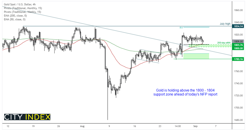 金价继续盘整,等待今天的非农就业报告。过去五个时段,金价一直受制于区间震荡,但还是守在1800-1805支撑区域上轨之上,该区域涵盖200天指数移动均线和周图中枢点位。