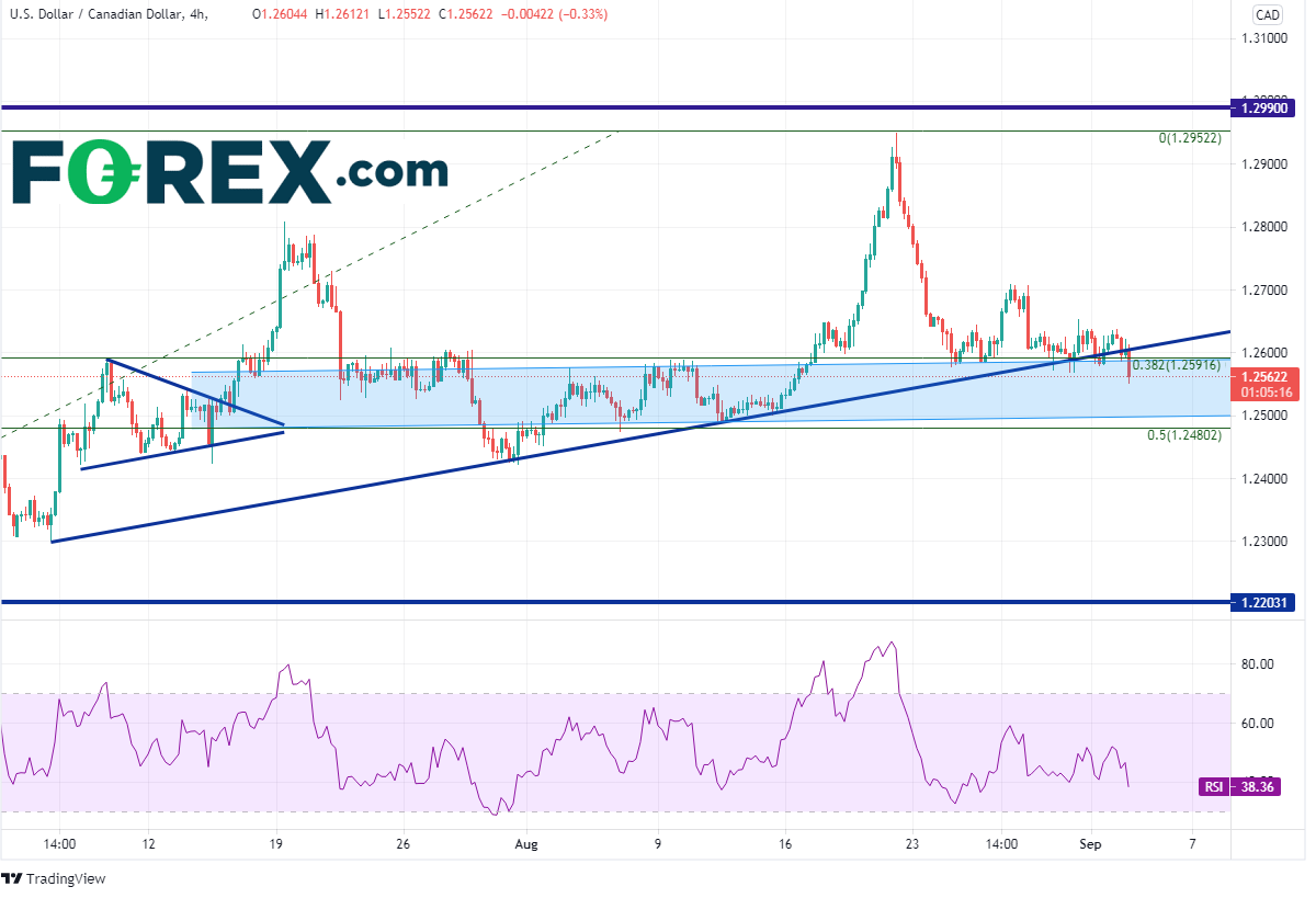 美元/加元正处于可能决定其未来方向的关键支撑区域。水平支撑带大致在1.2500-1.2600区间,1.2590和1.2480也分别是6月1日低点到8月20日高点行情的50%和61.8%回档位,为前述区间带来更多的支撑。另请注意,200天均线(没有显示)就在下方不远处的1.2534。如果价格攻克此支撑区域,可能考验1.2000附近的6月1日低点。但若可以自此区域反弹,可能再度上看8月20日高点1.2950附近。