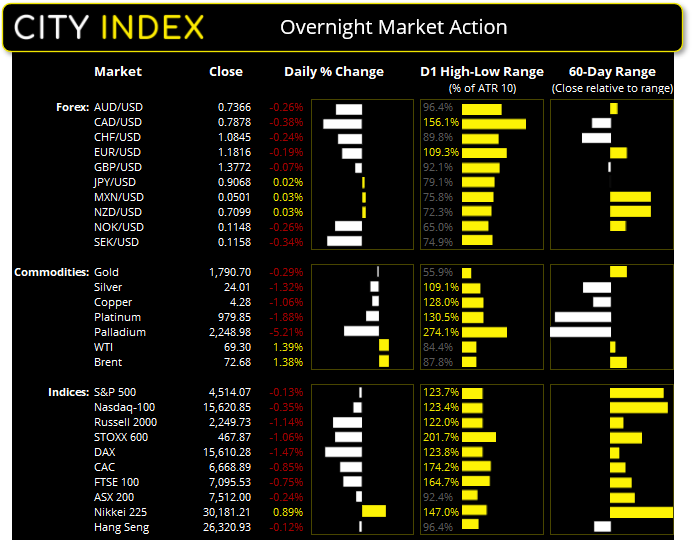 Delta变异病毒病例数继续增加,加上美联储官员Bullard声称应当很快开始缩表,科技股领跌华尔街。纳斯达克100指数下跌0.35%,道指跌0.2%,标普500指数跌0.13%。标普500指数11个板块中有7个板块下跌,受到了能源股与医疗健康股的拖累。