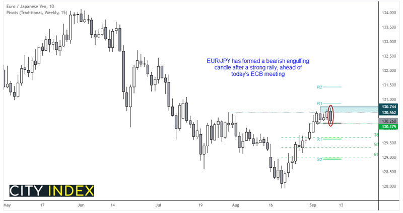 欧元/日元过去两周的走势和许多风险货币对的走势一样,即强力反弹,但现在展现出回调的意愿。欧元/日元未能守住130.56阻力位,随后形成看跌吞噬K线,目前等待欧洲央行召开会议,期待看到是否缩表的结论。欧洲央行的决策有很多种可能性,其中一种可能性是选择不缩表。那样的话可以推高欧元交叉盘。除非欧洲央行成员显著提高预测值(本质是暗示其将很快缩表),否则不会对欧元交叉盘构成压力。一旦展开逆势行情,有望强力突破130.17,同样清除周图枢轴位并下看129.60/65,那是38.2%回档位和周图第一中枢支撑位。
