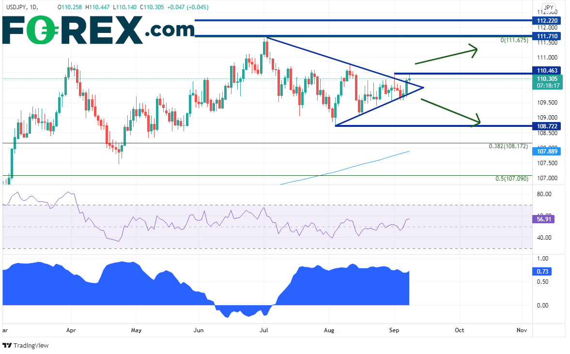 美元/日元日图自从测试了2020年3月高点并于7月2日创下111.71高点以来一直在一个对称三角形内震荡,周二时无限逼近三角形的相汇点,事实上在两条聚拢的趋势线的两端交投,并且当天收上上轨趋势线。到目前为止,该货币对延续涨势,摆脱三角形。但因为撞进水平阻力位110.46而动弹不得,如果站于其上,有望打开回升至7月2日高点的空间。